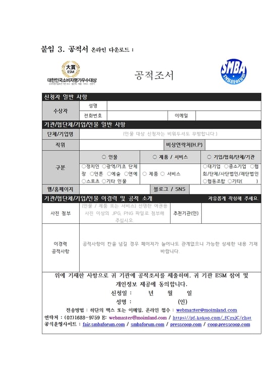 02-1688-9759 / 정책상 각 지역 소비자저널 대표단 또는 대의원(제휴기관장) 추천 필수 사항이며, 해당 기관을 통해 문의 및 접수 가능합니다. 위 공적서를 다운로드 받으신 후 해당사항 입력 후 하단의 연락처로 제출 바랍니다.